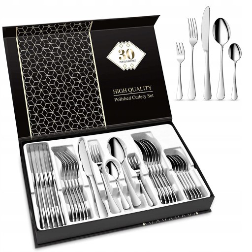- 30-częściowy zestaw sztućców zawiera 6 noży, 6 łyżek, 6 widelców obiadowych, 6 łyżeczek i 6 widelców deserowych, co czyni go doskonałym dodatkiem do każdego gospodarstwa domowego.