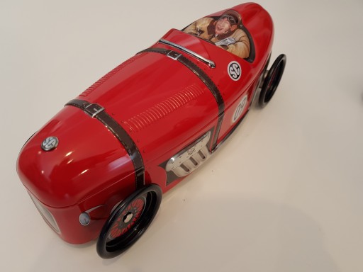 Samochód wyścigowy/Pojemnik/Puszka z Angielskiej kolekcji w stylu RETRO. Wykonana z wysokiej jakości blachy. Pokryta emalią. Koła się obracają. Nadaje się do żywności!