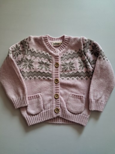 Fajny sweterek/ bluza marki Reflex, wykonana w 100% z wełny (porównując z innymi produktami tej marki uważam, że to w 100% z merino), delikatna, mięciutka, nie "gryzie". Rozmiar z metki 74. Zapinany na guziczki.