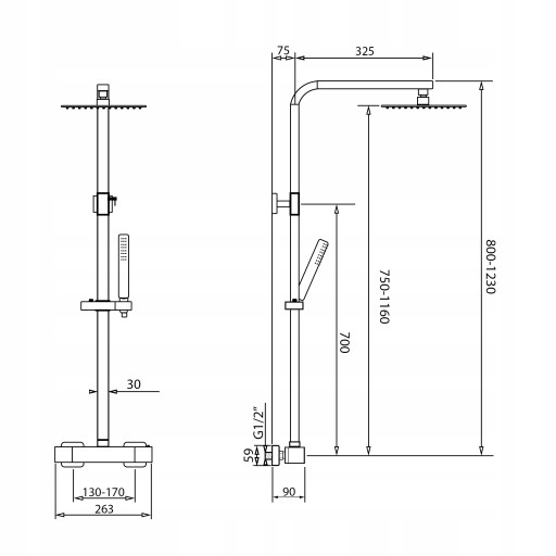 W zestawie znajdują się: drążek prysznicowy z deszczownicą, słuchawka prysznicowa z wężykiem, bateria z termostatem oraz dwie krzywki umożliwiające montaż baterii przy rozstawie przyłączy od 13 cm do 17 cm.