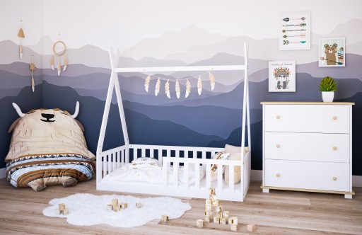 Łóżko „TIPI” to wygodne, funkcjonalne i atrakcyjne wizualnie rozwiązanie do pokoju dziecięcego, które pobudza wyobraźnię najmłodszych i zapewnia spokojny sen. Łóżko jest ustawione bezpośrednio na podłodze. Dzięki niskiej wysokości na jakiej znajduje się stelaż dziecko może samodzielnie z niego korzystać bez pomocy mamy i taty. „TIPI” zachwyca również skandynawskim designem, który z łatwością wkomponuje się w każdą przestrzeń.