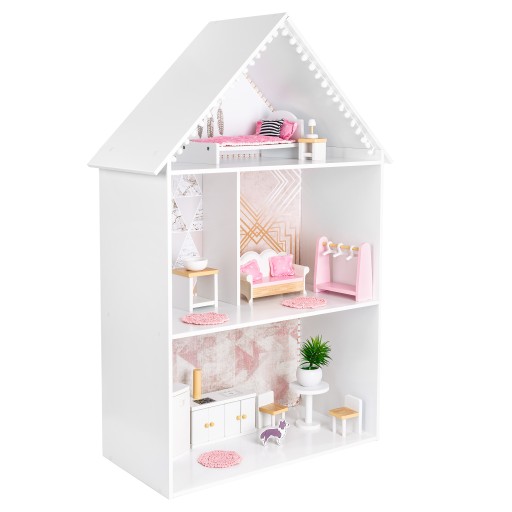 Przepiękny, duży domek dla lalek w kolorze białym. Domek do zabawy w pokoju dziecięcym. Nawet w pokoju o niedużym metrażu można zrealizować marzenie dziecka o własnym domku.