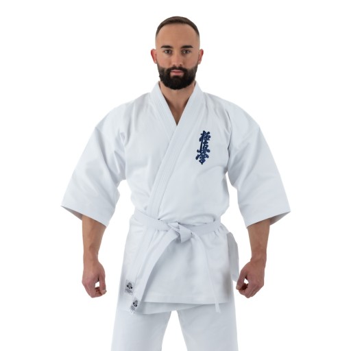 Bluzka kimona posiada szerokie opadające rękawy o długości ¾ oraz granatowy haft Kyokushin lewej piersi nadając jej charakterystyczny wygląd.