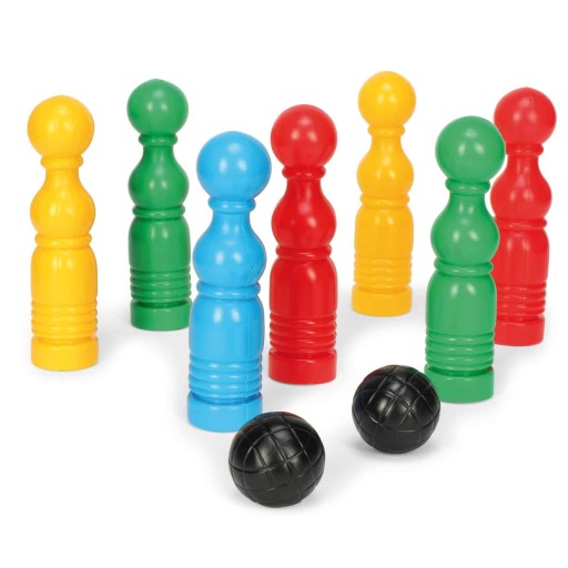 - komplet zawiera 7 różnokolorowych kręgli i 2 piłeczki