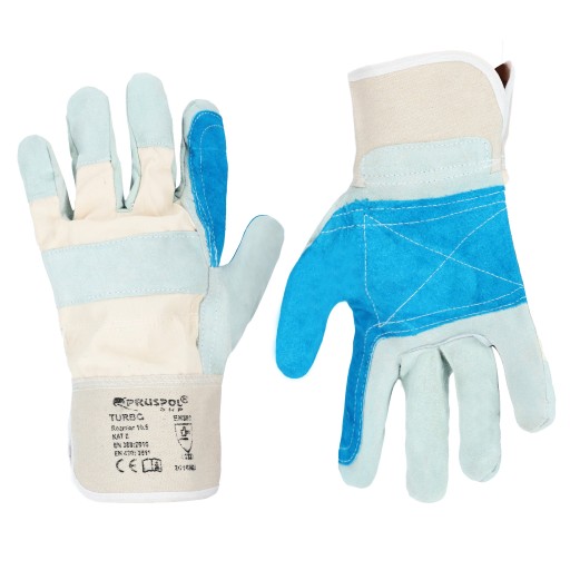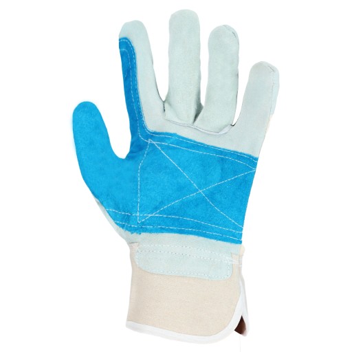 Rękawice robocze, ochronne, wykonane ze skóry bydlęcej, dwoinowej. Całodłonicowe, ze sztywnym podgumowanym mankietem w kolorze niebieskim. Część chwytna, palec wskazujący oraz kciuk dodatkowo wzmacniane skórą bydlęcą kolorze niebieskim, dzięki czemu rękawica jest odporniejsza na przetarcie i zużycie.