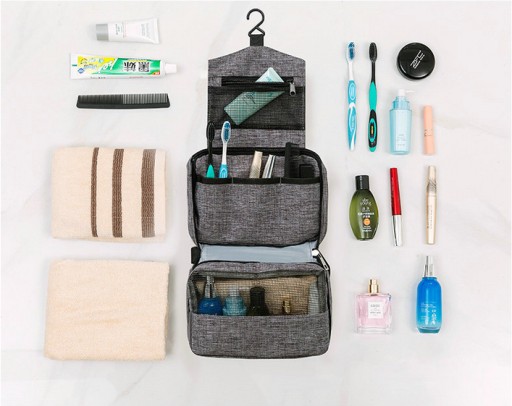 Pojemna kosmetyczka rozkładana z przegródkami. Kosmetyczka podróżna z wygodnym haczykiem do powieszenia.