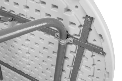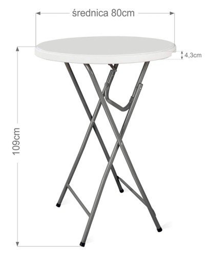 Blat wykonany z bardzo trwałego polietylenu. Rozmiar blatu: średnica 80 cm. Dopuszczalne obciążenie stołu to aż 100 kg! Dodatkowe blokada chroni przed przypadkowym złożeniem, a nogi zabezpieczone są gumowymi nakładkami chroniącymi powierzchnię przed zarysowaniem, a stół przed przesuwaniem się. Rama wykonana jest ze stali malowanej proszkowo.