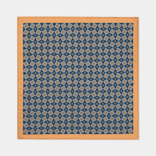 Granatowo-żółta poszetka w geometryczne wzory z kolekcji Pako Lorente. Poszetka wykonana w 100% z poliestru. Tkanina w kolorze żółtym, środek granatowy w całości pokryty jest żółto-białymi geometrycznymi wzorami.