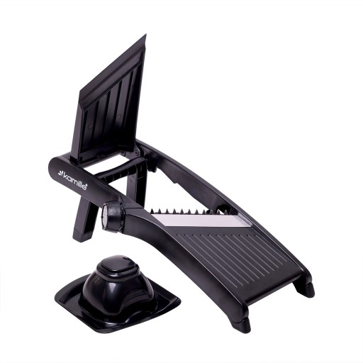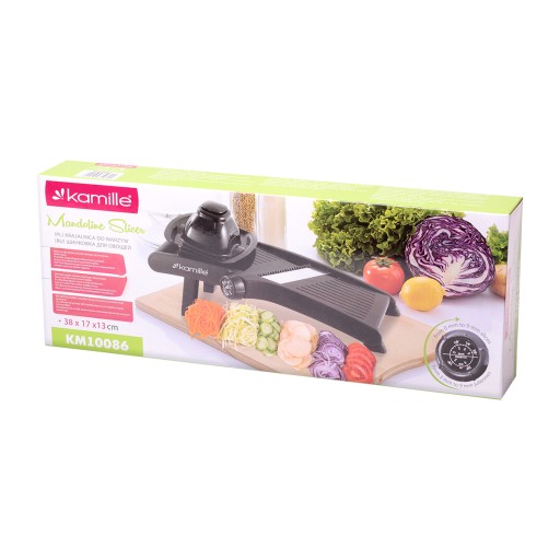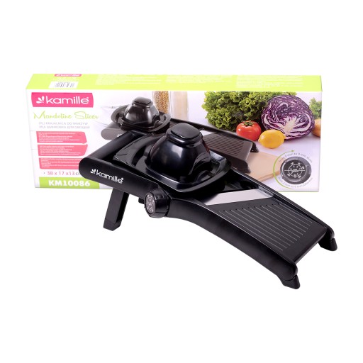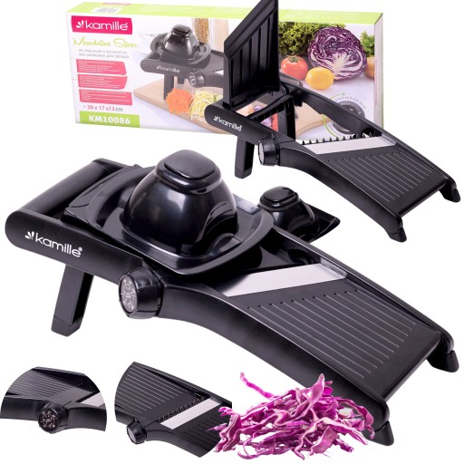 Urządzenie bardzo pomocne w szatkowaniu i fantazyjnym krojeniu. Szatkownica wyposażona w uchwyt do przytrzymywania krojonych produktów. W zestawie 3 noże do krojenia: w słupki - 3/9 mm oraz w plasterki - 3/6/9 mm. Antypoślizgowe nóżki zapobiegają przesuwaniu się szatkownicy podczas krojenia.