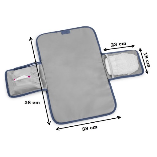 - powierzchnia kieszonek na pieluszki i chusteczki (po obu stronach maty): 23x18 cm