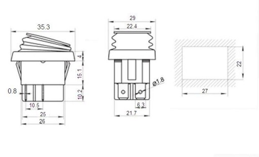 Przełącznik klawiszowy - 2 obwody - chwilowy - styki (ON)-ON - wodoodporna osłona chroniąca przełącznik - wyprowadzenia do lutowania przewodów, lub nasunięcia konektora samochodowego 6,3mm - ilość wyprowadzeń: 6 - Prąd / napięcie: 16A/250V - Podświetlenie: 230V - kolor klawisza: czerwony