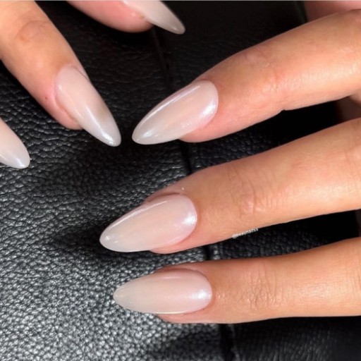 Tworzy na paznokciu taflę z lekko perłowym i lustrzanym efektem, która w zależności od kąta padania światła błyszczy srebrem lub metaliczną bielą. Oglądany w świetle sztucznym dodatkowo zaskakuje mikroskopijnymi brokatowymi punkcikami w odcieniu różu i delikatnego metalicznego pastelowego błękitu.