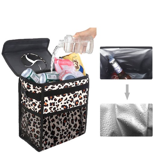 Nasz kosz samochodowy ma miękką pokrywę, gumowy otwór w kształcie litery X i zapięcie na rzep. Można go wypełnić ręcznikami papierowymi i miskami. Butelkę można zamknąć lub nawet przykryć pojemnik, aby zapach z wnętrza nie otworzył pokrywy.