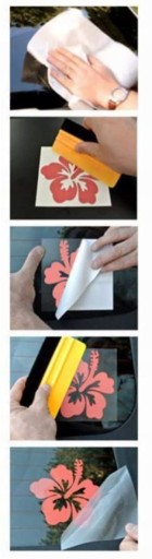- Aby uniknąć bąbli powietrza, przyklej naklejkę zaczynając od jej jednego boku. Uważaj aby nie przykleić od razu całej naklejki. Następnie stopniowo dociskaj raklą folie transportową aż do drugiego boku naklejki. Ponownie dociśnij raklą całą naklejkę.