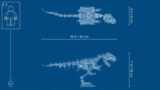 - Zestaw zawiera niesamowicie szczegółowe modele skamieniałości dinozaurów w skali 1:32 — tyranozaura i triceratopsa, oraz zabawkowy szkielet pteranodona. Do każdego z nich dołączona jest podstawka,więc możesz urządzić na swojej półce muzeum archeologiczne w stylu LEGO®.