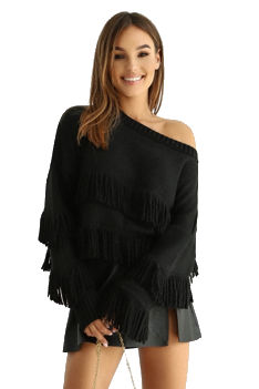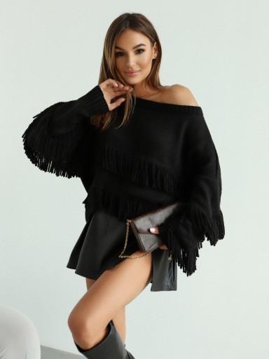 Sweter o oversize'owym kroju, o okrągłym dekolcie. Ozdobiony frędzlami.