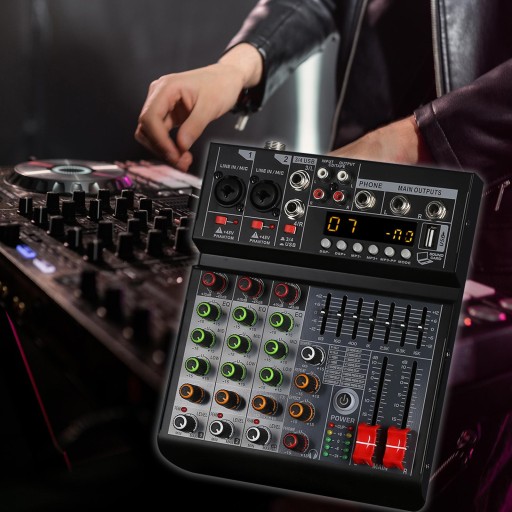 [Mikser 4-kanałowy]: Wielofunkcyjny profesjonalny mikser, 2-kanałowe wejście mono, 2-kanałowe wejście stereo. Regulacja balansu, jakość dźwięku wierności, połączenie USB, połączenie Bluetooth.