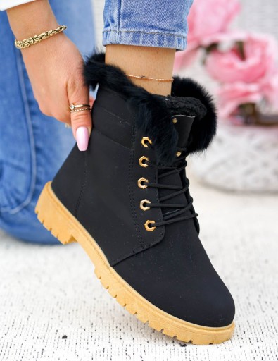 Czarne, efektowne trapery damskie. Buty w całości wykonane są z eco skóry. Ocieplane grubym, miłym futerkiemGruba, antypoślizgowa podeszwa, zapewni komfort użytkowania. Niebanalny look obuwiu nadaje czarny puszek.Traperki są sznurowane.