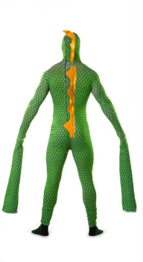 Kombinezon z kapturem zasłaniającym twarz koloru zielonego z wzorem imitującym skórę węża/smoka.