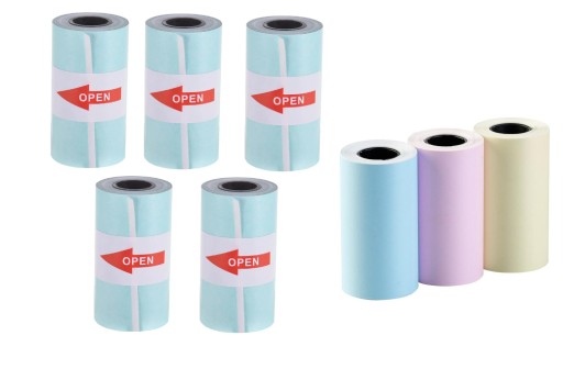 W zestawie: 5 rolek papieru białego oraz 3 rolki papieru kolorowego (różowy, niebieski, żółty)