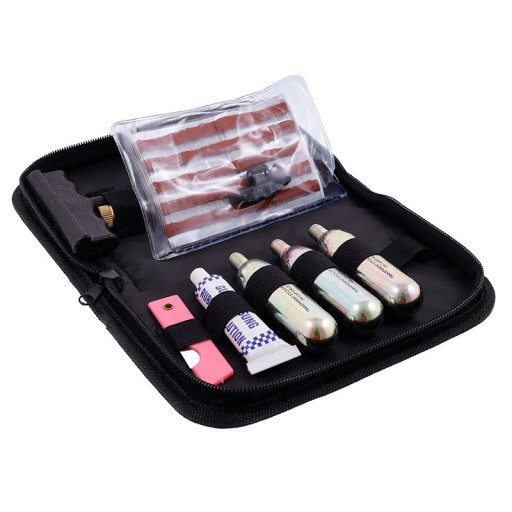 - Trzy kartusze z dwutlenkiem węgla, gotowe do użycia, umożliwiające błyskawiczną naprawę, bez konieczności pompowania ręcznego.
