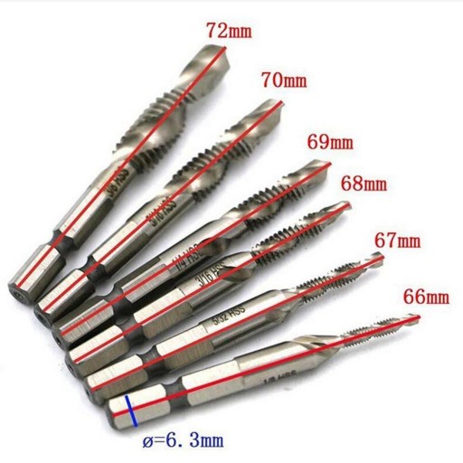 Szybkowymienny uchwyt sześciokątny 1/4" (6,35 mm) z wygrawerowanymi rozmiarami metrycznymi na bitach. flety odprowadzają wióry z otworu. Może być stosowany na głowicach wielowrzecionowych z mechanizmami odwracającymi do gwintowania w większości materiałów.