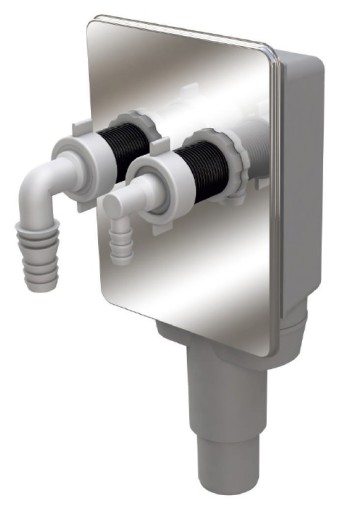 Podwójny syfon podtynkowy odprowadzający wodę ze sprzętów AGD. W zestawie 3 wymienne przyłącza do wyboru: 2 przyłącza do pralki/zmywarki oraz 1 przyłącze suszarki do ubrań. Przyłącza białe z maskownicą chrom.Syfon posiada rewizję. W zestawie montażowy karton zabezpieczający. Głębokość montażu w ścianie 54mm. Odpływ ø40/50mm.