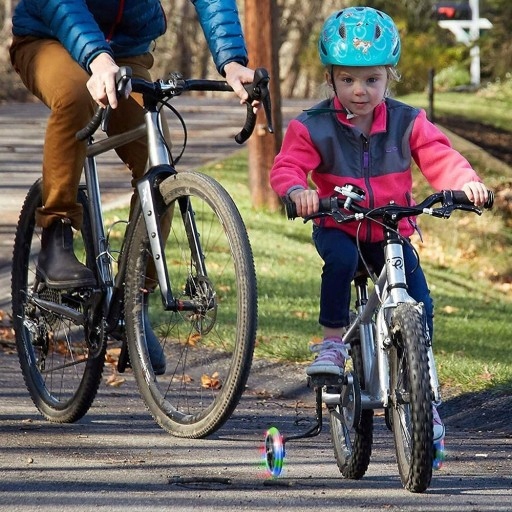 - Kółka do nauki jazdy będą się świecić podczas jazdy, dzięki czemu Twoje dziecko będzie bardziej widoczne i bezpieczne w nocy lub w ciemności. Ponadto fajny, podświetlany projekt sprawi, że dzieci będą zainteresowane nauką jazdy na rowerze.