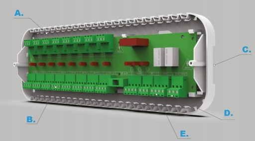 ⏩ 16 wyjść napięciowych 230 V (2 wyjścia na strefę) lub obciążenie każdej strefy do 0,3A (~70W)