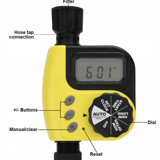 Ten automatyczny wyłącznik czasowy sprawia, że system nawadniania ogrodu staje się inteligentny i inteligentny. Nie martwisz się, że zapomnisz o podlewaniu roślin na czas lub zapomnisz zakręcić kranu. Połącz ten sterownik z wężem wodnym i ustaw, jak często i jak długo podlewać, naprawdę oszczędzając wysiłek i czas w zarządzaniu ogrodem. Obsługa opóźnienia deszczu i ręcznego podlewania, dzięki czemu czas ten jest wygodniejszy i oszczędniejszy.