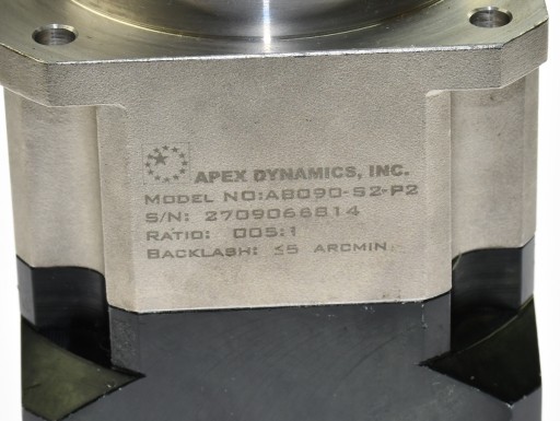 Używana, całkowicie sprawna przekładnia planetarna o oznaczeniu: AB090-S2-P2, produkt firmy APEX Dynamics, Inc. Przełożenie 5:1. S/N: 2709066B14. Pochodzi z demontażu całkowicie sprawnych maszyn przemysłowych pracujących w clean room.