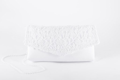 Torebka uszyta jest ze śnieżnobiałej tkaniny albowej oraz koronki, jest zapinana na rzep.