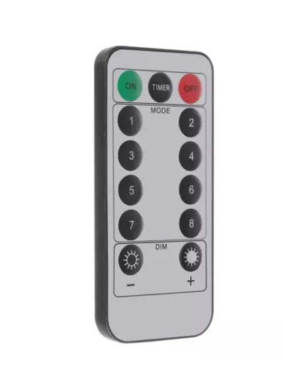 - PILOT + TIMER – do zestawu został dołączony pilot z 8 trybami świecenia oraz z włącznikiem i wyłącznikiem. Posiada także zdalną regulację jasności świecenia. Dodatkowo ma timer, który po włączeniu jest zaprogramowany na 6h świecenia, potem ma 18 godzinną przerwę i znów 6 godzin świecenia.