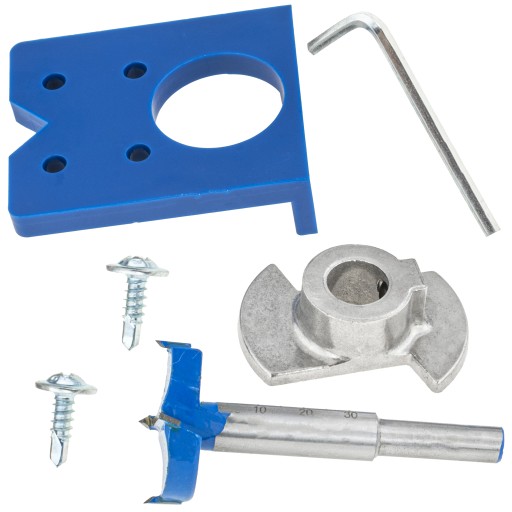 Praktyczny zestaw do precyzyjnego oznaczania, wiercenia oraz mocowania zawiasów puszkowych. Produkt składa się z szablonu wykonanego z wysokiej jakości tworzywa sztucznego oraz wiertła o odpowiedniej geometrii ostrza i średnicy 35 mm, pozwalających na wykonywanie równych wgłębień w meblach lub drzwiach. Wiertło przystosowane jest do pracy ze wszystkim rodzajami drewna miękkiego oraz płytami wiórowymi powlekanymi tworzywem. Szablon ułatwia znakowanie, pomiar i wiercenie, minimalizując przesuwanie się wiertła w trakcie pracy.