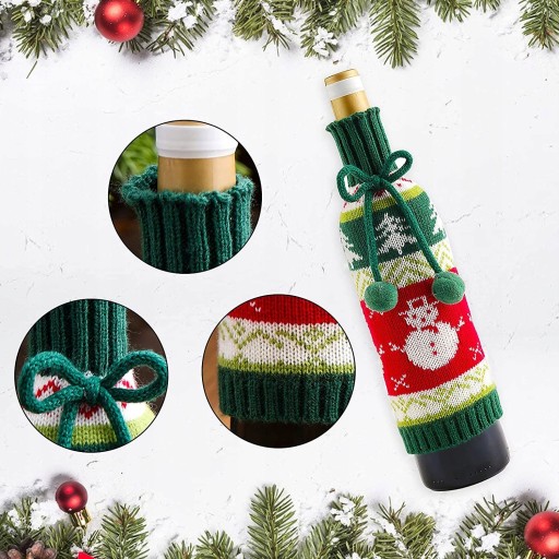 Słodkie Pokrowiec na butelkę wina - - Dzianinowe pokrowce na butelki zastępują nudne znaki i instrukcje na butelce wina uroczym wyglądem, uroczym świątecznym wzorem oraz małą wełnianą kulką, która dodaje żywego i ciepłego charakteru Twojej szafce na wino lub blacie.