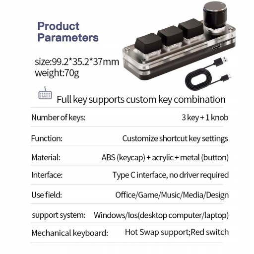 Jest to mini klawiatura z niestandardowymi funkcjami, interfejs typu C na USB, bez sterownika, plug and play, może ustawić wszystkie kluczowe funkcje na standardowej klawiaturze Windows, jeden klawisz, aby uzyskać skomplikowane i złożone kombinacje klawiszy skrótów, klawiatura ma Posiada funkcję przechowywania. Po skonfigurowaniu go w systemie Windows można go używać w systemach obsługujących protokół USB, takich jak Linux i MacOS. Operacja jest prosta i jest wygodna i łatwa do przenoszenia podczas podłączania wielu klawiatur. Pokrętło można ustawić, aby powiększać i pomniejszać, przycinać do poprzedniego utworu, następnego utworu, zwiększać głośność, zmniejszać głośność, pauzę, odtwarzać i inne funkcje, jest dobrym pomocnikiem do pomocy.
