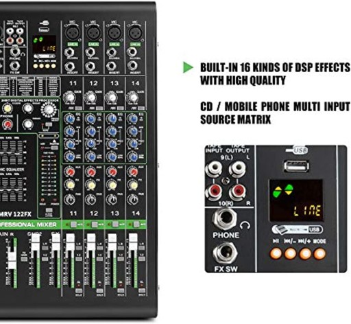 - Wbudowane wiele powszechnie używanych procesorów efektów: Wbudowane 16 rodzajów wysokiej jakości efektów DSP, wielowejściowa matryca źródłowa CD/telefonu komórkowego. Możesz przełączyć się na odpowiedni efekt DSP, aby uzyskać więcej różnych scenariuszy. Ten niezwykle wszechstronny mikser jest idealny do wysokiej jakości występów na scenie, występów na żywo i karaoke