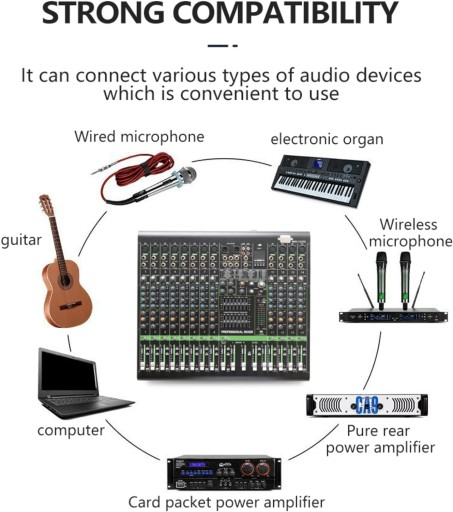 - Obsługa odtwarzania w wielu formatach: Dzięki funkcji odtwarzania Bluetooth można łączyć telefony komórkowe, tablety itp. Ten mikser audio może bezprzewodowo przesyłać strumieniowo utwory muzyczne z iPada, iPhone'a i smartfonów z systemem Android.Dzięki funkcji REC możesz nagrywać swoje ulubione utwory na dysk flash USB za pośrednictwem miksera.