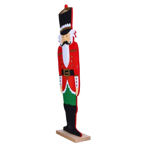 Krótkie streszczenie: Opisuje ozdobę świąteczną - filcowego dziadka do orzechów. Ozdoba jest wykonana z miękkiego filcu i ma solidną drewnianą podstawę. Jest utrzymana w klasycznych świątecznych kolorach - czerwonym, zielonym i czarnym. Może być wystawiona na stole, parapecie lub jako część dekoracji stołu wigilijnego. Figura ma 62 cm i jest wykończona złotymi akcentami. Jest doskonałym prezentem dla miłośników tradycji świątecznych.