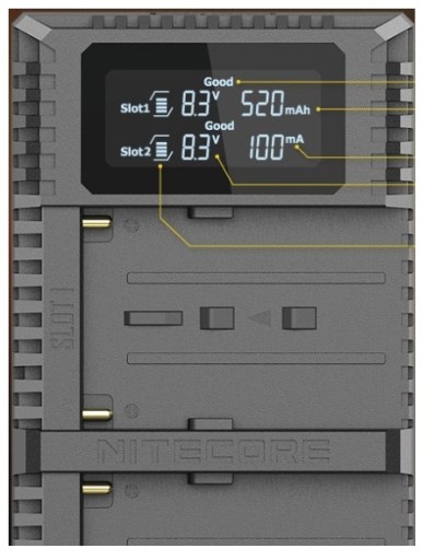 - Duży, wyraźny wyświetlacz LCD pokazujący aktualny stan naładowania baterii dla każdego slotu oddzielnie