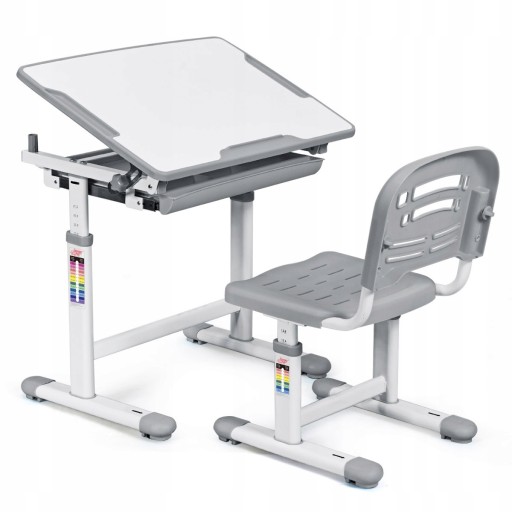 Możliwość regulacji - możliwość regulacji wysokości biurka w zakresie od 54.5 do 77 centymetrów oraz regulacji wysokości krzesła od 32 do 44 centymetrów sprawia, że zestaw rośnie wraz z dzieckiem. Dzięki funkcji zmiany kąta nachylenia blatu od 0 do 40°, można z łatwością dopasować stół do siebie i konkretnej aktywności