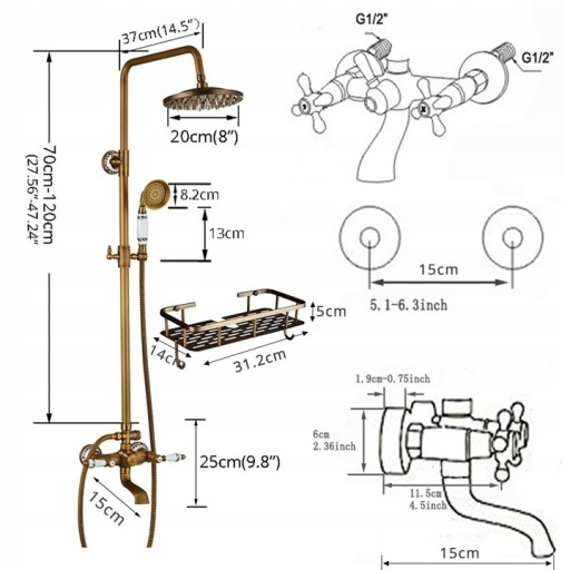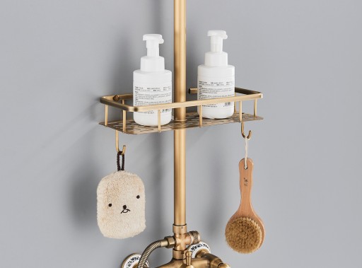 ✅ Zestaw prysznicowy Retro z deszczownicą i połką- Mosiądz