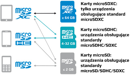 Karta pamięci microCARD UHS-I jest kompatybilna z urządzeniami oznaczonymi symbolem High Capacity (HC) oraz eXtended Capacity (XC).