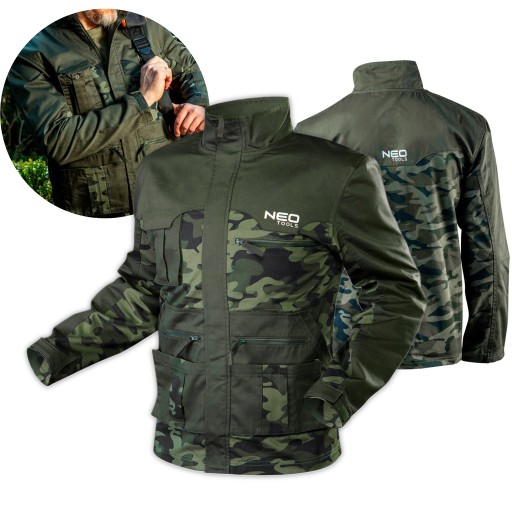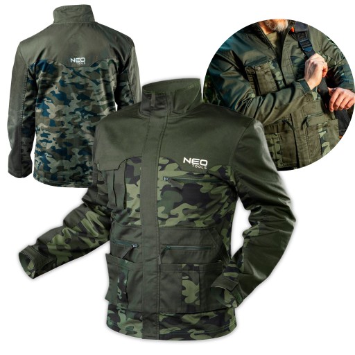Bluza robocza NEO z serii CAMO wykonana z wysokiej jakości bawełniano-poliestrowej tkaniny. Bluza zapewnia komfort użytkowania dzięki specjalnej konstrukcji rękawa, regulacji obwodu mankietu oraz wysokiej stójce. Produkt posiada kombinację wielofunkcyjnych kieszeni zapinanych na suwak, rzepy oraz zatrzaski. Podwojny materiał na barkach zapewnia wyższą odporność na uszkodzenia mechaniczne. Bluzę wyróżnia unikalny wzór moro, a nowoczesny krój pozwala na użytkowanie produktu również poza pracą. Gwarantem jakości jest certyfikat europejski oraz wykonanie zgodne z normą EN ISO 13688:2013. Marka NEO spełnia oczekiwania profesjonalistów.