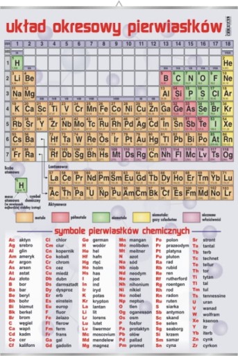 Plansza edukacyjna przedstawiająca układ okresowy pierwiastków wraz z wyjaśnieniem symboli poszczególnych pierwiastków.