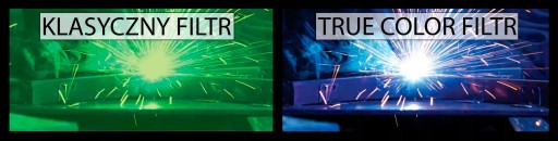 Ogromną zaletą maski jest zastosowany filtr TRUE COLOR, który sprawia że przedmioty wyglądają bardziej realistycznie, są bardziej czytelne i mają swoje naturalne kolory! Takie rozwiązanie zapewnia lepszą kontrolę wykonywanych prac oraz idealną widoczność. Porównanie klasycznego filtra i TRUE COLOR przedstawia grafika poniżej.