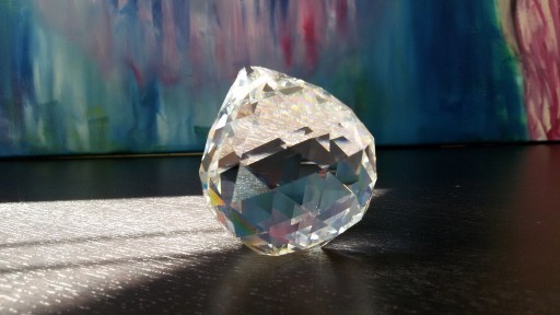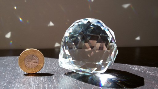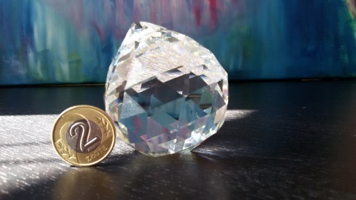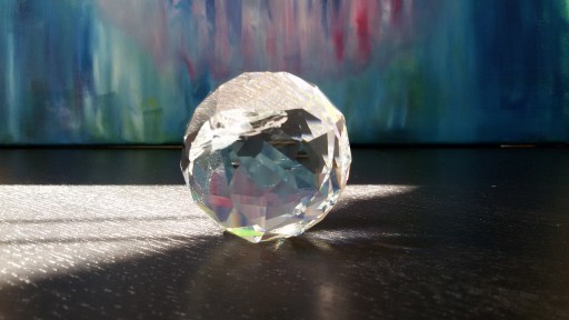 OPIS AUKCJI - Kryształ kula kryształowa o średnicy 5 cm. Może być zawieszką do żyrandoli bądź elementem wystroju okna, wnętrza. Kryształ wysokiej jakości, dający piękny błysk.