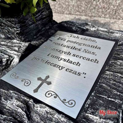 Dodatkowym elementem tego zestawu jest tabliczka z laminatu, wygrawerowana sentencją "Tak cicho bez pożegnania zostawiłeś nas, w naszych sercach i umysłach po wieczny czas," oraz wzorem graficznym krzyża. Ta tabliczka dodaje głębi i osobistego wyrazu doniczce nagrobnej, czyniąc ją wyraźniejszą.