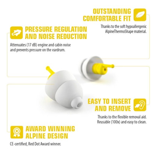 Noszenie zatyczek do uszu FlyFit podczas lotu reguluje uciążliwy nacisk na bębenki podczas startu i lądowania. Filtry działają jak zawory i zapewniają stopniową i stałą równowagę ciśnień między środowiskiem zewnętrznym a uchem środkowym. W ten sposób trąbka Eustachiusza ma wystarczająco dużo czasu na aklimatyzację do zmian ciśnienia. Ponadto specjalne filtry akustyczne w zatyczkach do uszu FlyFit zapewniają ochronę przed irytującym hałasem otoczenia. Zatyczki do uszu ułatwiają odpoczynek i relaks podczas długich lotów, ale doskonale sprawdzają się również podczas podróży autobusem, pociągiem i samochodem. Zatyczki do uszu Alpine Pluggies Kids są dostępne dla dzieci, które odczuwają ból ucha podczas podróży samolotem.