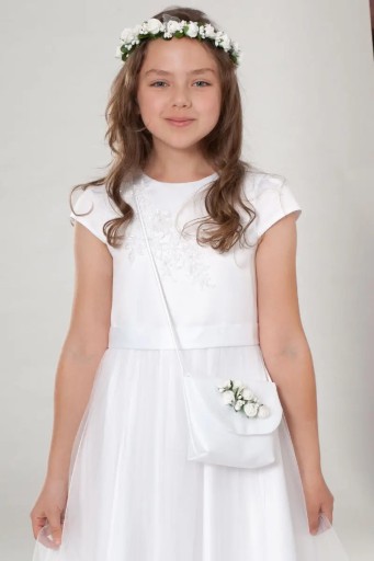 Torebka komunijna uszyta z białej satyny ślubnej na sznureczku atłasowym do przewieszenia przez ramię. Torebeczka jest gładka zdobiona kokardą atłasową z białymi kwiatuszkami i białą gipsówką, od środka usztywniana przez co ładnie się prezentuje. Torebka zapinana na rzepa.